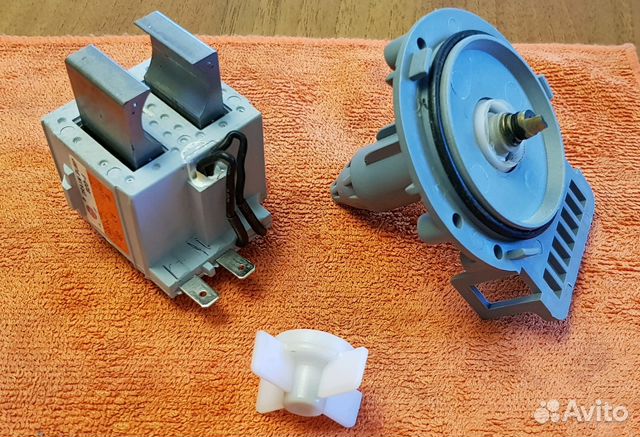 насос для откачки воды в стиральной машине. в моделях старого образца насос имеет две крыльчатки. он участвует в каждом рабочем цикле и естественным образом изнашивается. определите насколько сильно стала шуметь помпа в процессе откачки воды. подбор по модели стиралки.
